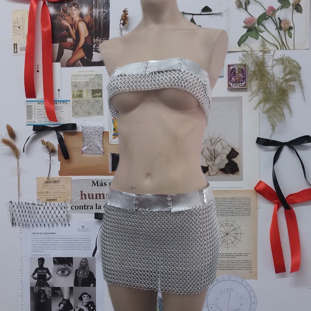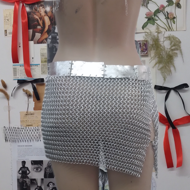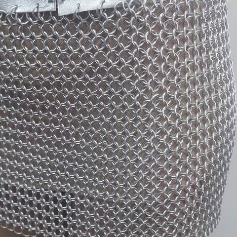 Materiales: Engarse de argollas en aluminio, cuero y cadenas. Cierre en mosquetones. TECNICA MALLA MEDIEVAL