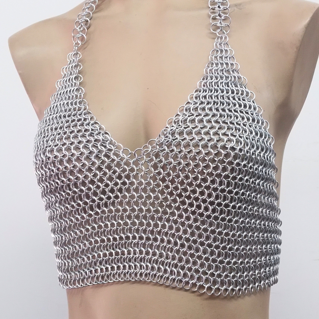 Materiales: Engarce de argollas en aluminio, cuero y cadenas. Cierre en mosquetones. TECNICA MALLA MEDIEVAL